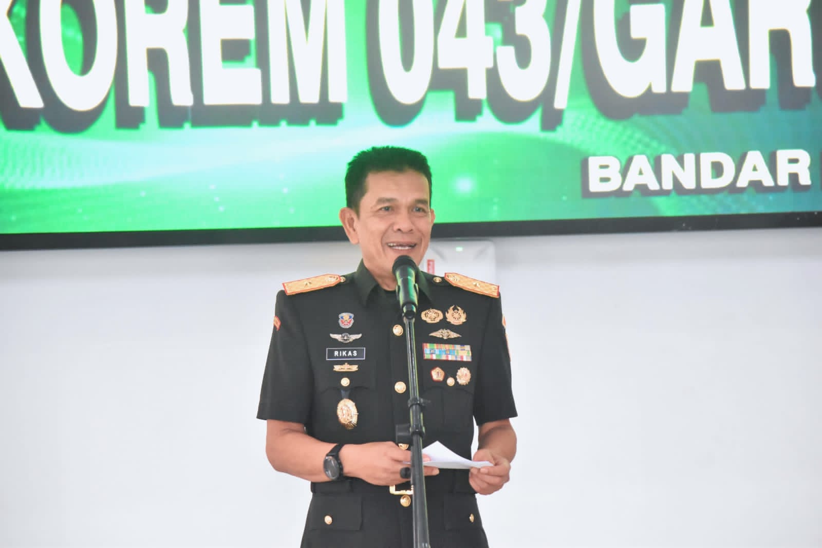 Lebih lanjut, Danrem mengucapkan selamat datang dan bertugas kepada Kolonel Inf Sumarlin Marzuki, S.E., beserta istri sebagai Kasrem 043/Gatam; Kolonel Czi Kurniawan Hartanto, S.E., M.Han., beserta istri sebagai Kasiren Korem 043/Gatam; Letkol Inf A. Wakhid Dedy Setyawan, S.I.P., M.H.I., beserta istri sebagai Kasiops Kasrem 043/Gatam; dan Letkol Arm Roni Hermawan, S.H., M.M., beserta istri sebagai Dandim 0410/Kota Bandar Lampung.